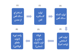 از دیگر نکات قابل تأمل، وضعیت پروژههای احیاء و فولاد سازی در شرکت سرمد ابرکوه میباشد. برای تبیین دقیق تر تصویر شماتیک زنجیره استخراج سنگ آهن از معدن تا تولید مقاطع فولادی بصورت ذیل ارائه میگردد: