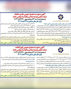 بمنظور اطلاع و حضور شما سهامداران گرامی شرکت تجلی توسعه معادن و فلزات ، به استحضار می رساند. آگهی دعوت به مجمع عمومی عادی سالیانه منتهی به سال مالی 29 اسفند 1401 در صفحه 10 روزنامه دنیای اقتصاد مورخ 3 خرداد 1402 چاپ و منتشر شده است. زمان برگزاری:شنبه مورخ 20 خرداد 1402 ساعت 10 صبح . مکان برگزاری : سالن تلاش مجموعه فرهنگی ورزشی کار و امور اجتماعی واقع در : تهران – خیابان ولیعصر- بالاتر از مسجد بلال – نرسیده به چهارراه پارک وی برگزار خواهد شد. به امید دیدار شما سهامدار محترم