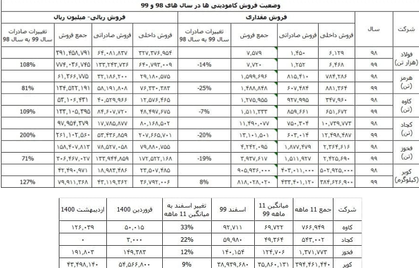 بر اساس آمار و اطلاعات منتشر شده در سایت کدال کامودیتی ها در سال 99 نسبت به سال 98 با رشد قابل توجهی در فروش صادراتی همراه شدند. درآمدهای فروش صادراتی شرکت های فولاد، هرمز، کاوه، کچاد، فخوز و کویر در دوره 12 ماهه سال 99 نسبت به مدت زمان مشابه سال گذشته بین 71 تا 200 درصد افزایش یافته است ، اما نکته بااهمیت تر آن اگر چه مجموع فروش مقداری صادراتی این شرکت ها در سال 99 نسبت به سال 98 با کاهش نسبی مواجه شده اما شرایط در اسفند ماه تغییر بسیار محسوسی یافته است.