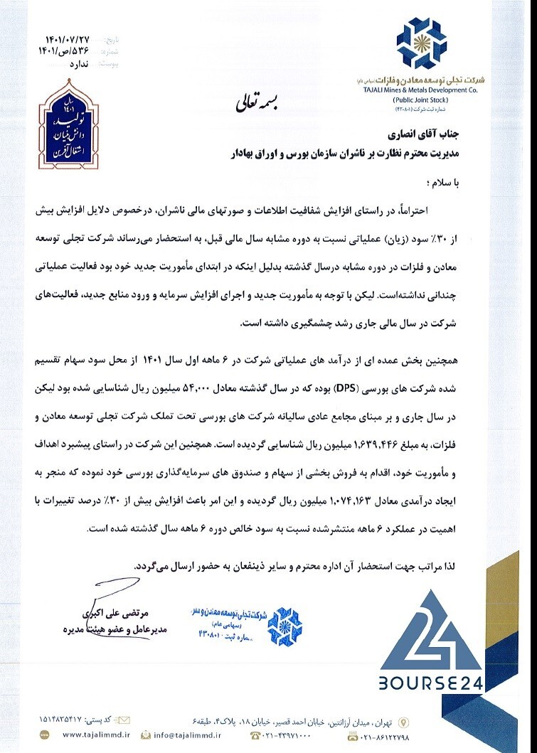 شرکت تجلی توسعه معادن و فلزات با نماد بورسی «تجلی» در خصوص برخی موارد صورتهای مالی شفاف سازی کرد.