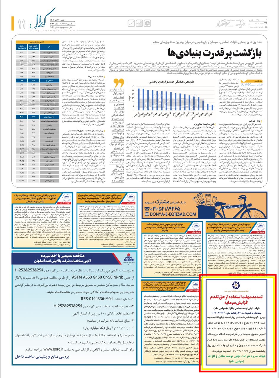 پیرو آگهی منتشر شده در روزنامه دنیای اقتصاد به شماره 6043 مورخ 10/04/1403 و به موجب مجوز شماره 156691 / 122 مورخ 20/04/1403 با هدف تأمین حقوق سهامداران گرامی به اطلاع می رساند مهلت استفاده از حق تقدم افزایش سرمایه این شرکت به مدت 7 روز و تا پایان وقت اداری روز یکشنبه مورخ 31/04/1403 تمدید می گردد.