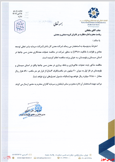 بر این اساس، شرکت معدن کار باختر (شرکت سرمایه پذیر تجلی توسعه معادن و فلزات با مالکیت ۳۹.۵درصد) به منظور شرکت در مناقصه عملیات معدنکاری معدن مس جانجا در استان سیستان و بلوچستان، به عنوان برنده مناقصه اعلام شده است.