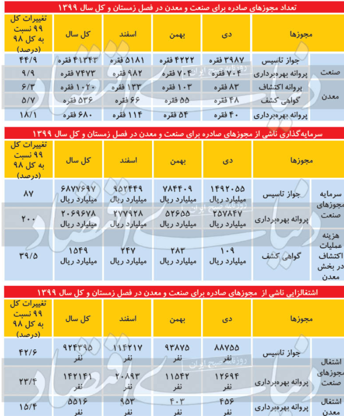 بخش صنعت در سالی که گذشت از سیاست‌گذار صنعتی 41343 فقره جواز تاسیس دریافت کرد که به معنی رشد حدودا 45درصدی این بخش است. رشد دریافت پروانه‌های بهره‌برداری اما حدود10درصد بوده و در مجموع سال 99 به عدد 7473 فقره رسیده است. در بخش معدن هم میزان پروانه‌های بهره‌برداری با رسیدن به عدد 680 فقره از رشدی نزدیک به 18درصد برخوردار شده است. پروانه اکتشاف هم در این سال به تعداد 1020 فقره برای معدنکاران صادر شده و رشدی 3/ 6 درصدی را تجربه کرده است. گواهی کشف نیز با افزایش 7/ 5 درصدی در تعداد روبه‌رو شده و در کل سال 99 به تعداد 536 فقره صادر شده است. در بخش اشتغال ناشی از مجوزها نیز وضعیت مثبت و رو به رشد بوده است. رشد اشتغال‌زایی ناشی از مجوزهای تاسیس با رسیدن به عدد 924395 به 6/ 42 درصد در کل سال99 رسیده و کاملا از وضعیت سال98 جدا شده است. اشتغال‌زایی واقعی ناشی از شروع فعالیت واحدهای تولیدی که به بهره‌برداری رسیده‌اند هم در گزارش وزارت صمت رشدی 3/ 23 درصدی را نسبت به سال 98 تجربه کرده و به عدد 142141  نفر رسیده است. در بخش معدن هم در نتیجه فعالیت‌های سالانه این بخش، 5516شغل جدید در واحدهای به بهره‌برداری رسیده ایجاد شده تا معدنکاران در استخدام نیرو نسبت به سال 98 چیزی معادل 4/ 15درصد رشد را تجربه کنند.