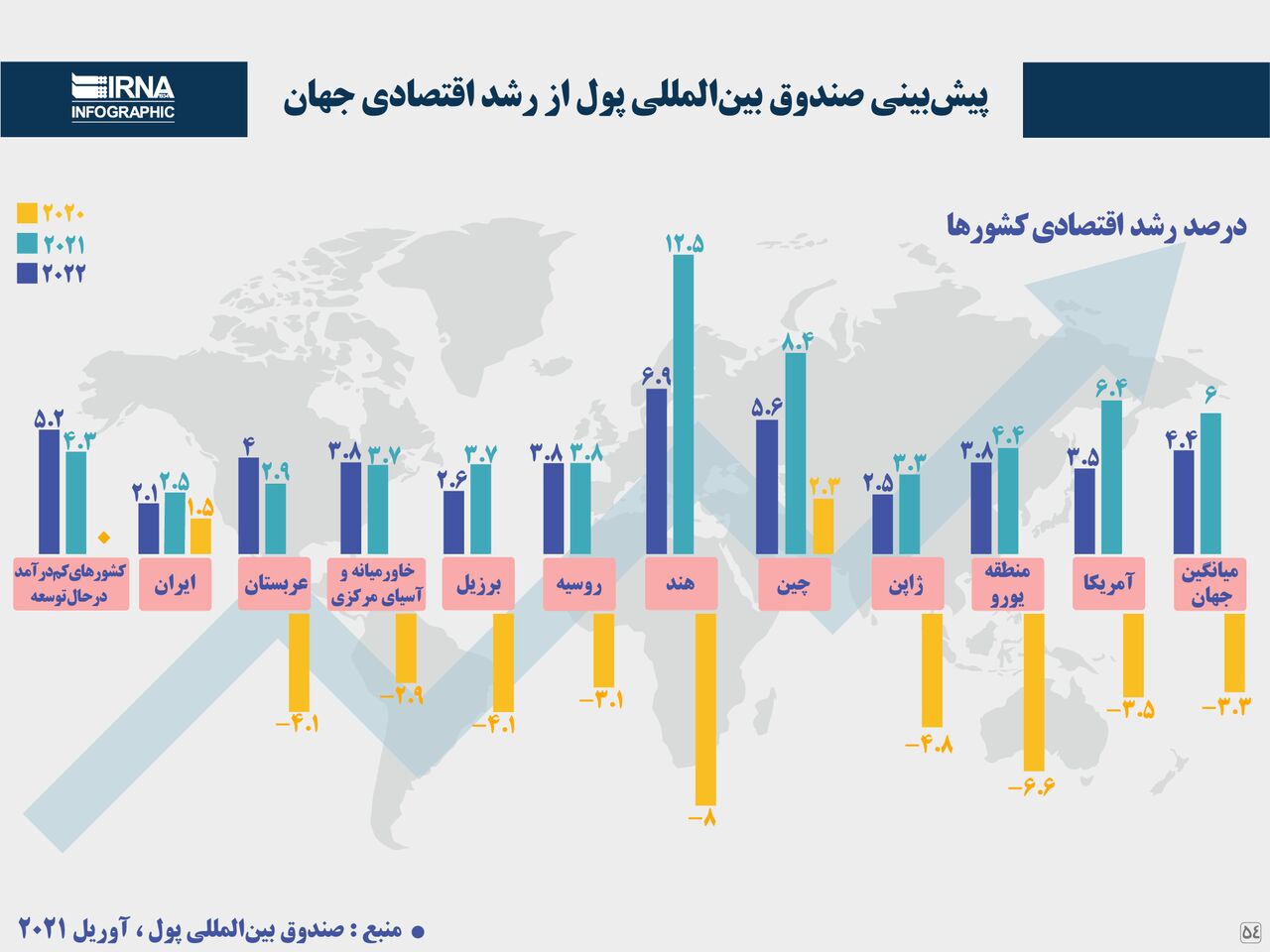 صندوق بینالمللی پول در آخرین گزارش خود پیشبینی کرده است که پس از افت بیسابقه در سال ۲۰۲۰ اقتصاد جهان در سال ۲۰۲۱ رشد ۶ درصدی و در سال ۲۰۲۲ رشد ۴.۴ درصدی را تجربه خواهد کرد. پیشبینی این نهاد از وضعیت اقتصادی سایر مناطق جهان را ببینید.
